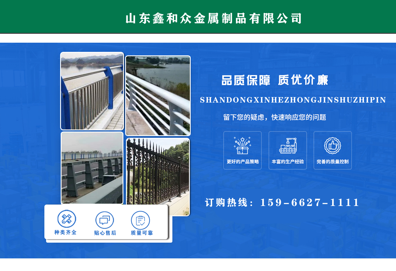 山東鑫和眾金屬制品有限公司主要產(chǎn)品有防撞護欄,橋梁護欄,道路護欄,河道護欄,不銹鋼護欄等護欄。提供設(shè)計方案,一站式定制,包您滿意價格優(yōu)惠,歡迎來電咨詢! 公司常年從事銷售護欄防撞護欄,橋梁護欄,道路護欄,河道護欄,不銹鋼護欄,橋梁鋼護欄,河道燈光護欄等。產(chǎn)品廣泛應(yīng)用于橋梁、河道、旅游景區(qū)、道路、公路、公園、小區(qū)、景觀、道路防撞等領(lǐng)域。 公司產(chǎn)品均采用優(yōu)質(zhì)不銹鋼材料,符合相關(guān)標(biāo)準(zhǔn)。各種型號不銹鋼復(fù)合管及護欄,質(zhì)量嚴格把控。產(chǎn)品強度高、耐腐蝕、焊接牢固、抗沖擊、性能好,防撞護欄結(jié)構(gòu)簡單、美觀實用大方。 歡迎前來訂購!...